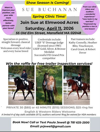 Contact Paula Jewell to sign up for a lesson with Sue Buchanan in Mansfield, MA on April 11th. All Heritage Dressage members may have their ring fees reimbursed by contacting Heritage via email.